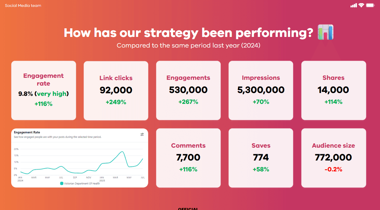 Department of Health social media performance (inclusive of FB, IG, X & LI) June-November 2025 (from commencement of my role) vs same period 2024 (before joining)